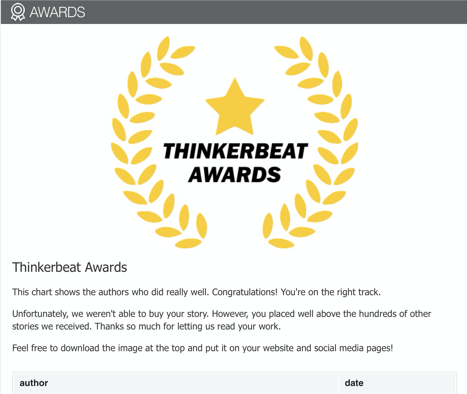 Update 3/22: It looks like Thinkerbeat is now calling their rejections a “Thinkerbeat Award.” Not that they like your story enough to buy it, but they still want you to give them some free advertising by putting the image on your website. (A very Writers-Of-The-Future-like practice. Good to know that markets with a predatory approach to their writers are learning from each other. Sigh.)