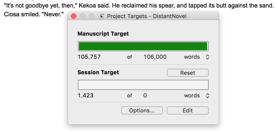 A quick little accounting for my own benefit: of our two main characters, currently 51,000 words from Kekoa’s perspective, and 52,000 from Ciosa’s. I don’t think I could’ve gotten those numbers so close if I’d tried.