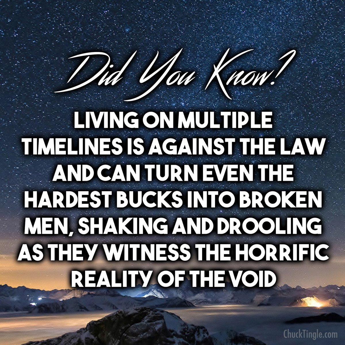 Finally, this marks my second recent story where multiple timelines lead to terrible danger. I cannot close this post in good conscience without this safety warning from the esteemed Dr. Chuck Tingle: